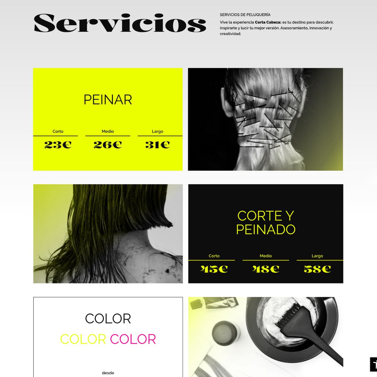 A nivel visual, se crearon imágenes específicas con un marcado estilo editorial, reforzando el carácter creativo y profesional de Corta Cabeza. La jerarquía de contenidos se resolvió mediante un sistema tipográfico de contraste, con un uso coherente de titulares (H1, H2, H3), párrafos y estilos de botones. El resultado es una web renovada, funcional y alineada con la identidad de la marca, que mejora la experiencia del usuario y refuerza la presencia digital de Corta Cabeza.